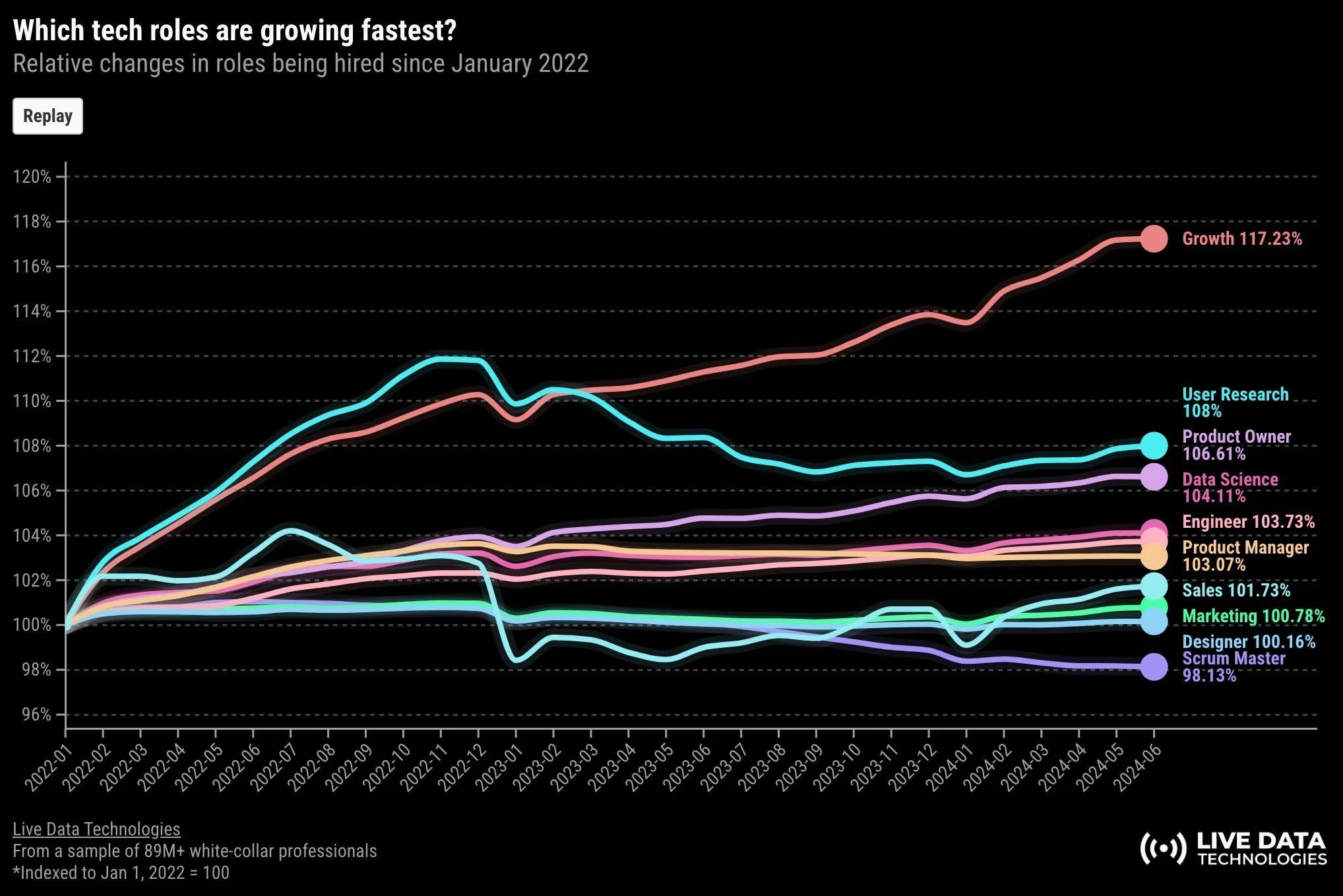 An analysis by Lenny Rachitsky of Lenny’s Newsletter shows that growth roles have increased by over 117% in the US in the past 2 years. In the US, growth roles are one of the fastest-growing roles right now within the tech industry (data as of July 2024).
